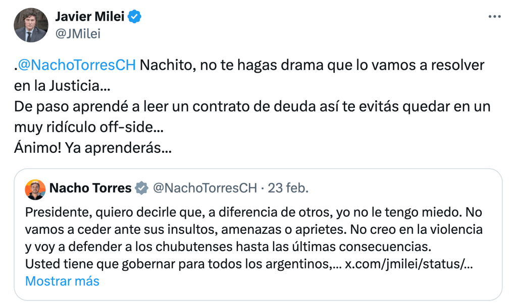 Se sabe que hay una deuda de Chubut con la Nación, una fórmula de actualización conforme al CER, una imposibilidad de pagarla en un contexto de megainflación, un pedido provincial de refinanciación, una cláusula que permite su cobro directo como descuento de coparticipación y un deseo oficial de aprovechar la situación para escarmentar al resto de las provincias. En esa puja, los líderes involucrados no reparan en costos sociales: el Presidente funde a las provincias y las provincias quieren volver a la iluminación a aceite.