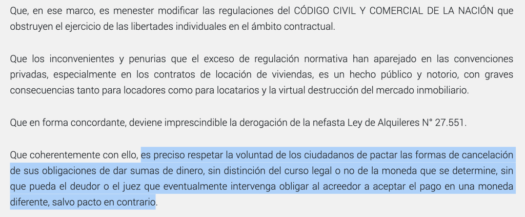 Dicho DNU establece la libre elección de moneda para todo tipo de contrato. Sólo haría falta un empujón oficial para estimular pagos y cobros en dólares y una perspectiva de valorización de la divisa estadounidense para que la pelota comience a rodar. En ese escenario, ¿quién que esté en condiciones de reclamar que se le pague en dólares elegiría hacerlo en pesos? Ese sería el avance gradual.