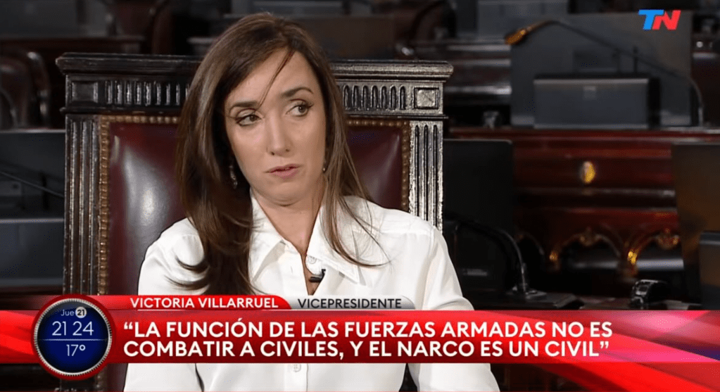 En la noche de este jueves, Victorial Villarruel realizó una explosiva aparición en TV en la que se diferenció del Presidente en asuntos sensibles como el carácter –»soy más templada que él», dijo–, el pliego de Lijo, el DNU 70/2023, el apego a la legalidad, las dietas de los legisladores, la licuación de las jubilaciones y hasta la aplicación de «la motosierra a lo Freddy Krueger«. Fuerte con el Presidente, a quien definió como «un pobre jamoncito» entre ella y la «brava» Karinaa Milei. También resultó relevante su ataque al involucramiento de los militares en seguridad interior.
