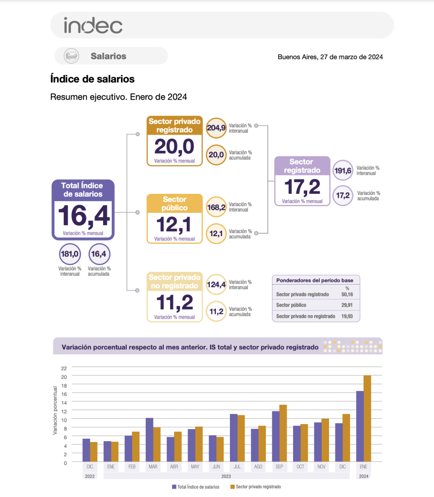 La comparación interanual da todavía peor. «En términos interanuales, el Índice de salarios mostró una suba de 181% como consecuencia de los incrementos del 204,9% en el sector privado registrado, 168,2% en el sector público y 124,4% en el sector privado no registrado», señaló.
