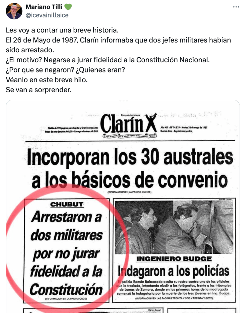 El mismo es presentado siempre por ella como un héroe condecorado por su participación en la guerra del Atlántico Sur, pero la historia oficial que pretende escribir el gobierno paleolibertario, no sin ayuda una y otra vez en medios privados, omite que dichas distinciones le fueron retiradas por haberse negado a jurar en 1987 fidelidad a la Constitución Nacional. Este interesante hilo de Twitter relata esa saga.