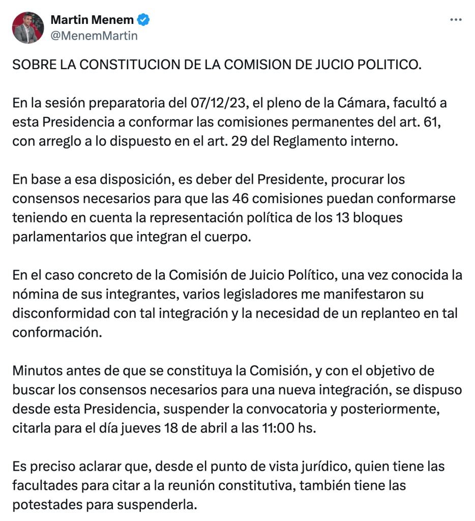 En concreto, Menem trató de forzar in limine la suspensión de la reunión de ayer por orden de Karina, operacionalizada por su primo Eduardo «Lule» Menem.
