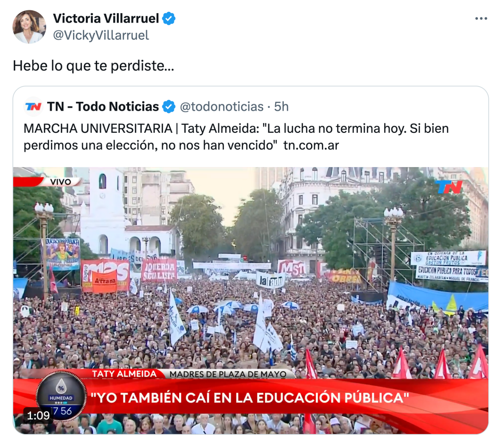 Pasada la marcha, Victoria Villarruel la rebajó a su guerra privada por la reivindicación de la dictadura y respondió con una provocación.