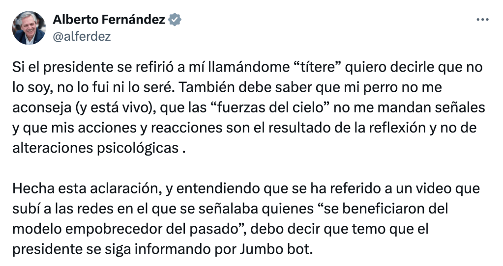 Más allá de valoraciones políticas, Fernández es un expresidente de la Nación y su respuesta en un largo posteo en Twitter habilitó la cuestión del carácter de Milei como un tema de debate. Sobre todo cuando, entre otros conceptos filosos, le reclamó «saber que mi perro no me aconseja (y está vivo), que las ‘fuerzas del cielo’ no me mandan señales y que mis acciones y reacciones son el resultado de la reflexión y no de alteraciones psicológicas«.