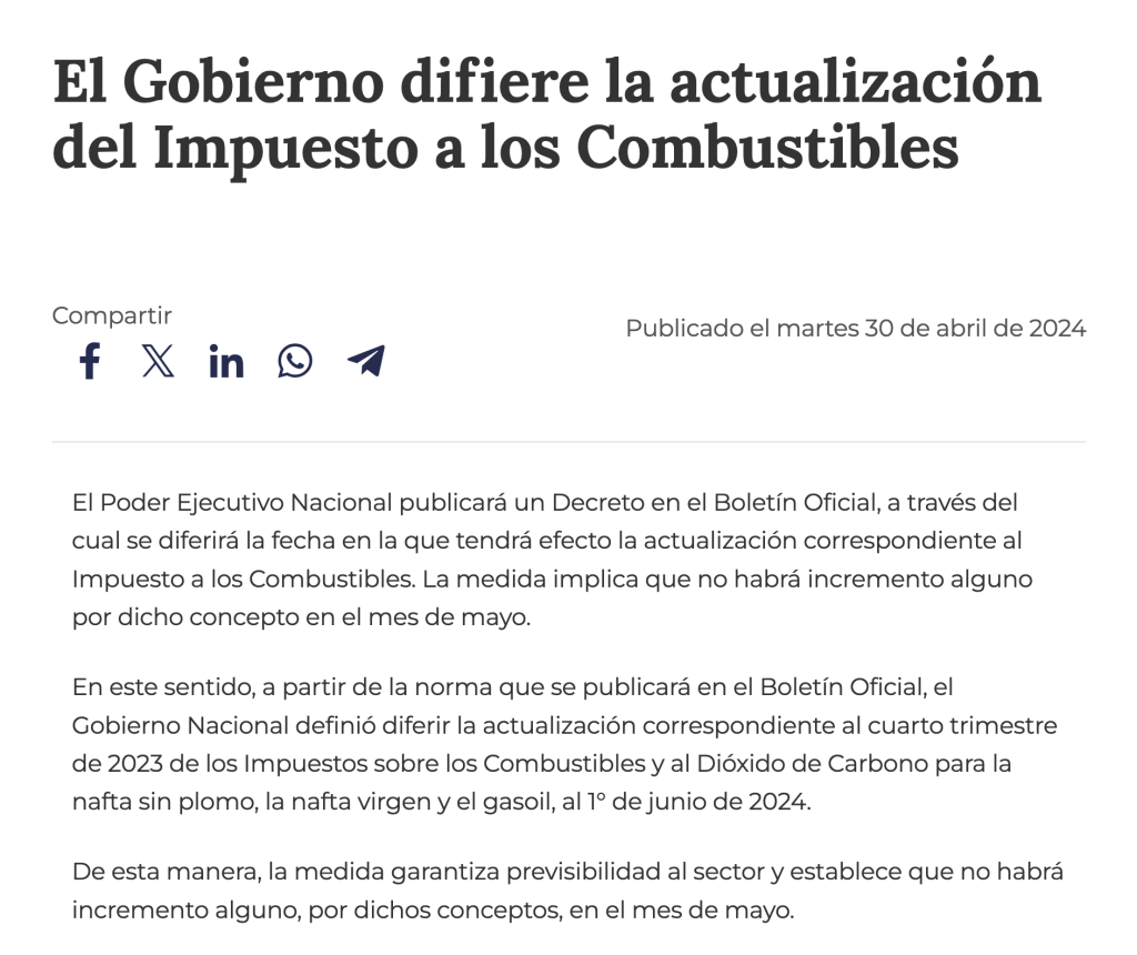 Si se presta atención, el compromiso de pisar la actualización del impuesto a los combustibles apenas se refiere al mes en curso, lo mismo que lo referente a las tarifas. Ocurre que mayo viene de por sí cargado con subas en subte y tren en el área metropolitana, Internet, telefonía, TV por cable, alquileres y colegios privados en la provincia de Buenos Aires. Es mejor dosificar.