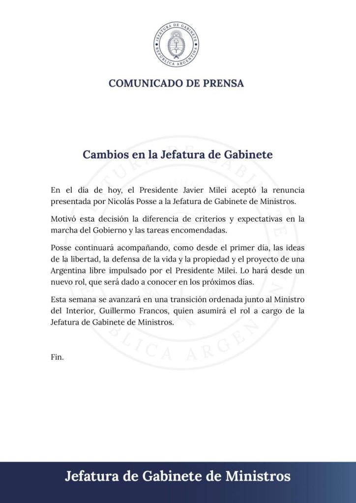 Dadas como están las cosas, ¿estará el país en manos del peor equipo del último medio siglo? La insatisfacción quedó plasmada en la noche del lunes al consumarse la eyección confirmada de su jefe, Nicolás Posse, a quien se le achacó –entre otros males– un desempeño moroso y quien será reemplazado por Guillermo Francos. «Fin», dice la versión del comunicado publicada por Jefatura de Gabinete… Se divierten.