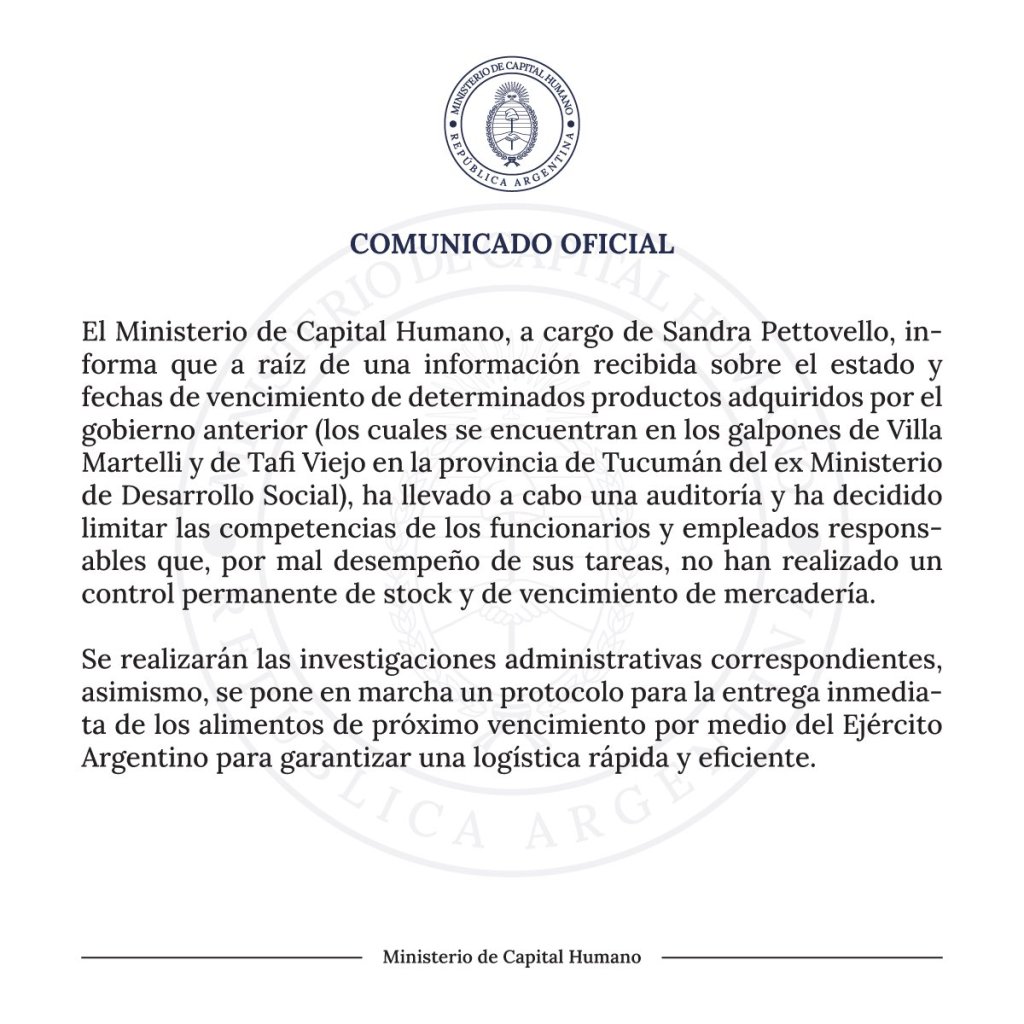 El texto habla de «información recibida sobre el estado y fechas de vencimiento de determinados productos adquiridos por el gobierno anterior», de «una auditoría» y de la decisión de «limitar las competencias de los funcionarios y empleados responsables que, por mal desempeño de sus tareas, no han realizado un control permanente de stock y de vencimiento de mercadería». Ante eso, ordenó «la entrega inmediata de los alimentos de próximo vencimiento por medio del Ejército Argentino», entre ellos 900.000 kilos de leche en polvo, 5.000 de harina de maíz y algunas toneladas de puré de tomate con caducidad en julio.