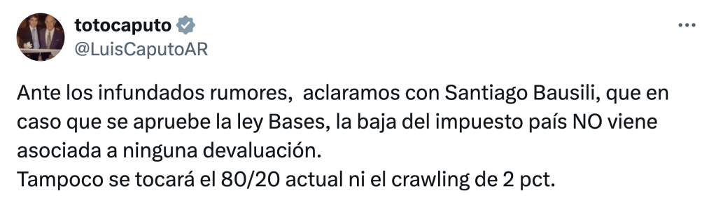 No por nada, Toto Caputo se encargó de aclarar que no prepara una nueva devaluación en caso de que el Senado sancione el proyecto de ley ómnibus XS y el Gobierno cumpla con la promesa de retrotraer el impuesto PAIS –que grava las importaciones y los gastos con tarjeta en el exterior– del 17,5% impuesto al inicio de la gestión al 7,5% que había dejado Sergio Massa.