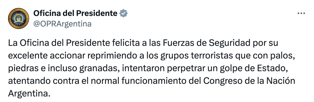 El Presidente no genera precisamente certidumbre para el capital cuando sobreactúa hechos que se han dado en Argentina bajo todos los gobiernos –y en innumerables países del mundo, incluidos muchos desarrollados– y se declara víctima de «terrorismo» y de «un intento de golpe de Estado». Sería bueno que moderara su grandilocuencia.