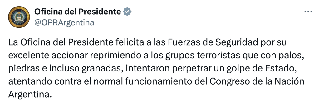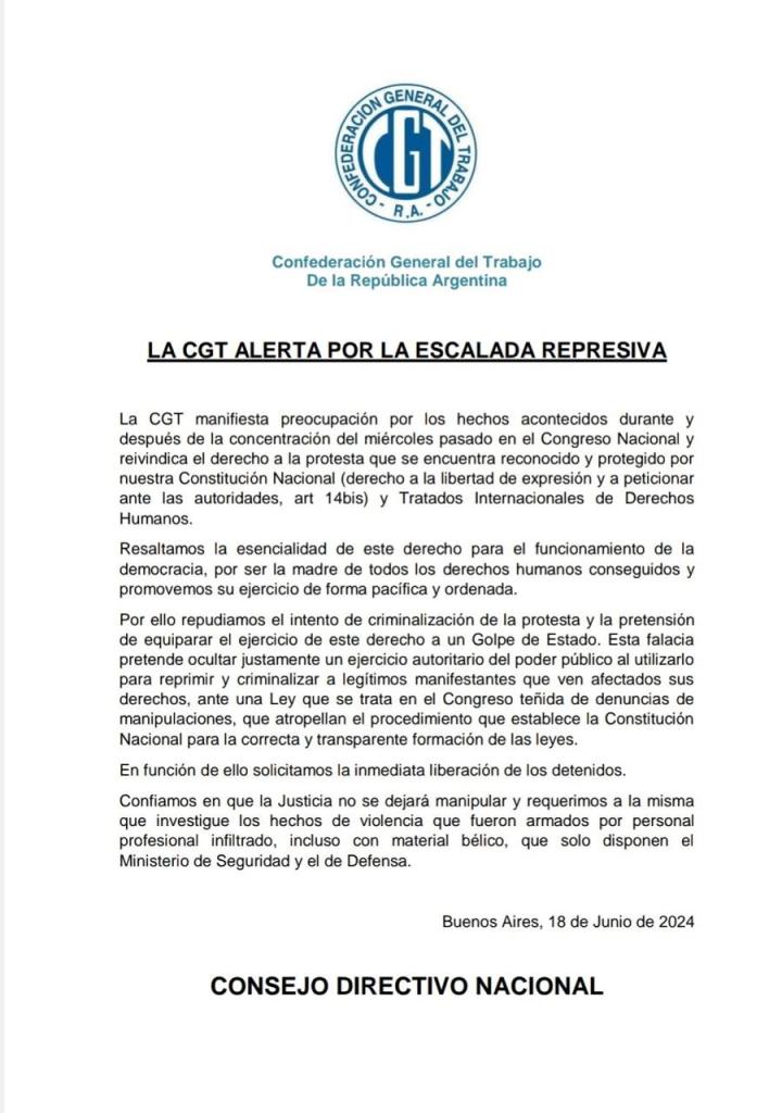 Por su parte, conciente de los peligros de una limitación de facto del derecho de reclamar, la CGT repudió «el intento de criminalización de la protesta y la pretensión de equiparar el ejercicio de este derecho con un golpe de Estado».