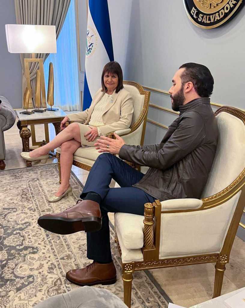 La ministra tiene la idea fija también en su segundo tiempo. Foto con Bukele en espejo con el reclamo por los detenidos por protestar contra la ley Bases.