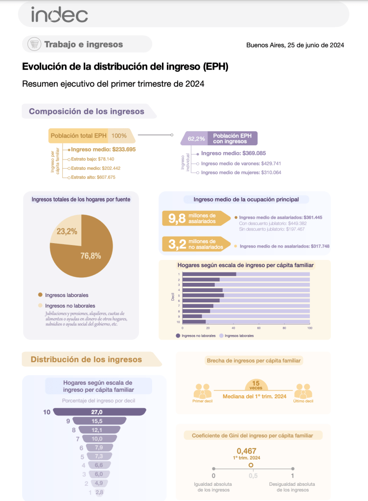 Según reseñó Página|12, el ingreso per capita alcanzó en el primer trimestre a 233.695 pesos, mientras que el promedio de la la población ocupada asalariada fue de 361.445 pesos.