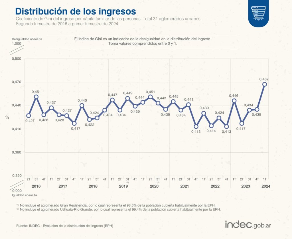 El INDEC ofreció un gráfico de la evolución del indicador inventado por Corrado Gini que arranca en 2016, el que muestra un serrucho un tanto inespecífico hasta su inocultable empinamiento actual.