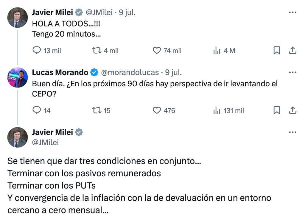 El economista jefe de FIEL, Daniel Artana, entrevé señales oficiales de que eso podría darse antes de fin de año. ¿Será así? Manuel Adorni aclaró: «Nunca tuvimos la proyección de que a fin de año se iba a terminar con el cepo». Mientras, el propio jefe de Estado explicó en Twitter que una de las condiciones para lograrlo es que la inflación se acerque a cero.