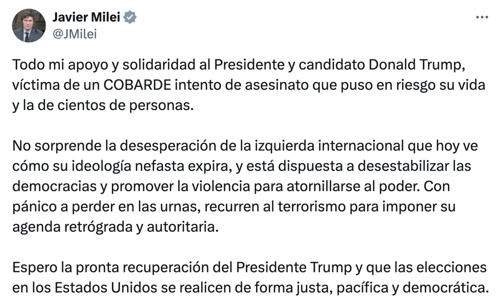 El amor es más fuerte y el de Javier Milei por Trump es particularmente intenso. Al revés de lo que hizo ante otros hechos internacionales, esta vez su reacción al intento de asesinato del presidenciable republicano fue veloz e incluyó un posteo que orilló peligrosamente una acusación de instigación contra el oficialismo demócrata.