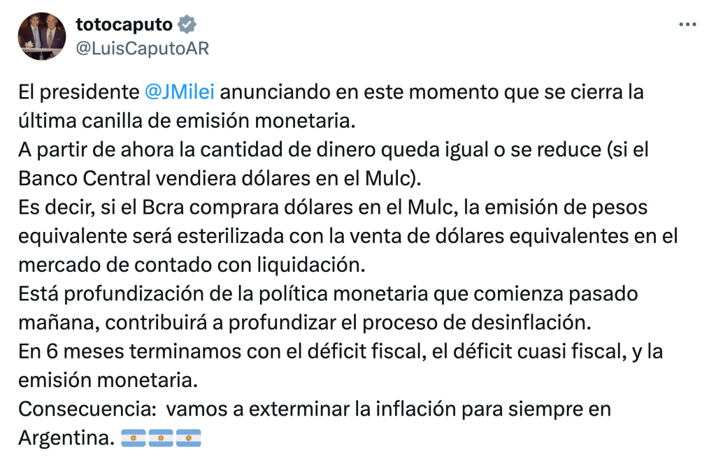 Milei aseguró el sábado en una entrevista con La Nación + que «de acá en adelante la base monetaria en Argentina no crece más y esa es una noticia tremendamente contundente». «Cerramos el grifo de la emisión de compra de dólares», explicó.