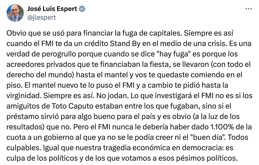 Eso terminó cuando el FMI le impuso al líder del PRO que se deshiciera de un funcionario que consideraba ampliamente irresponsable, pero les dejó a los argentinos miles de millones de dólares registrados como una pesada deuda intergeneracional. En paralelo, claro, ganancias fabulosas a esos tipos audaces que juegan con las cartas marcadas en países con gobiernos que se hacen los bobos.