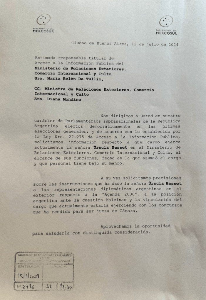 Por eso, el grupo peronista de representantes argentinos en el Parlamento del Mercosur elevó un pedido de informes para conocer qué posición ocupa Basset en la Casa y qué políticas fija. Se aguarda respuesta.