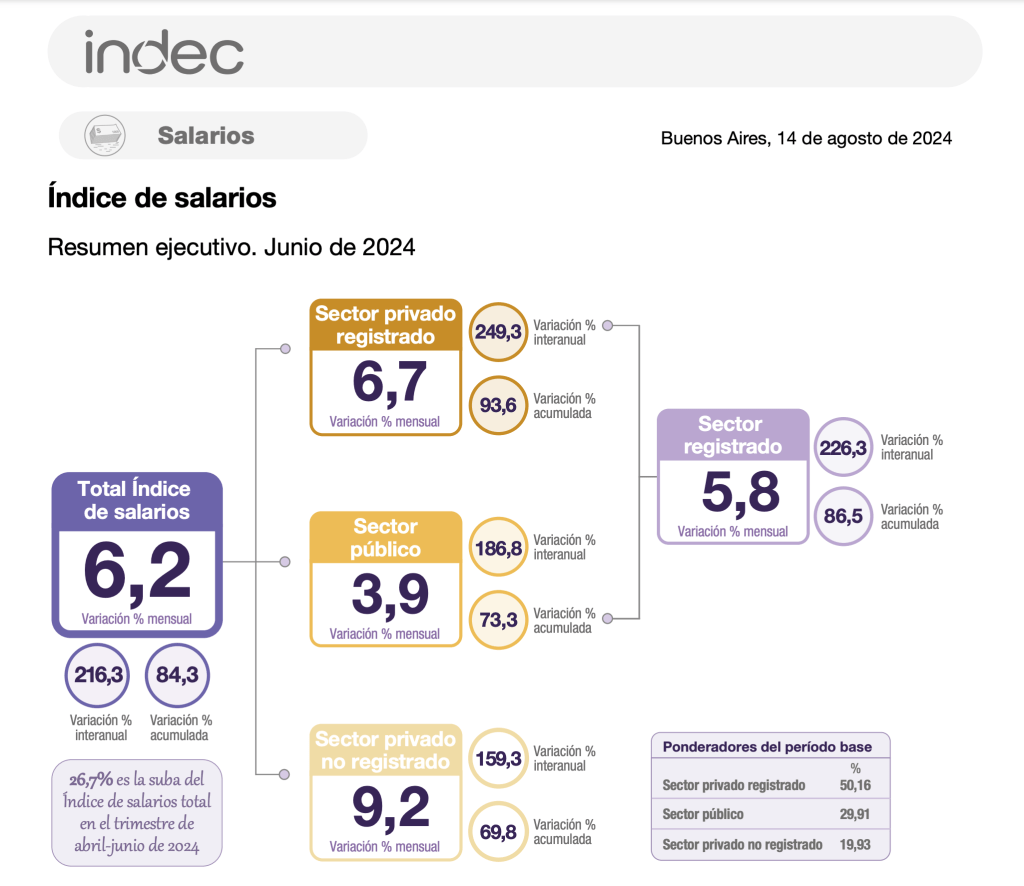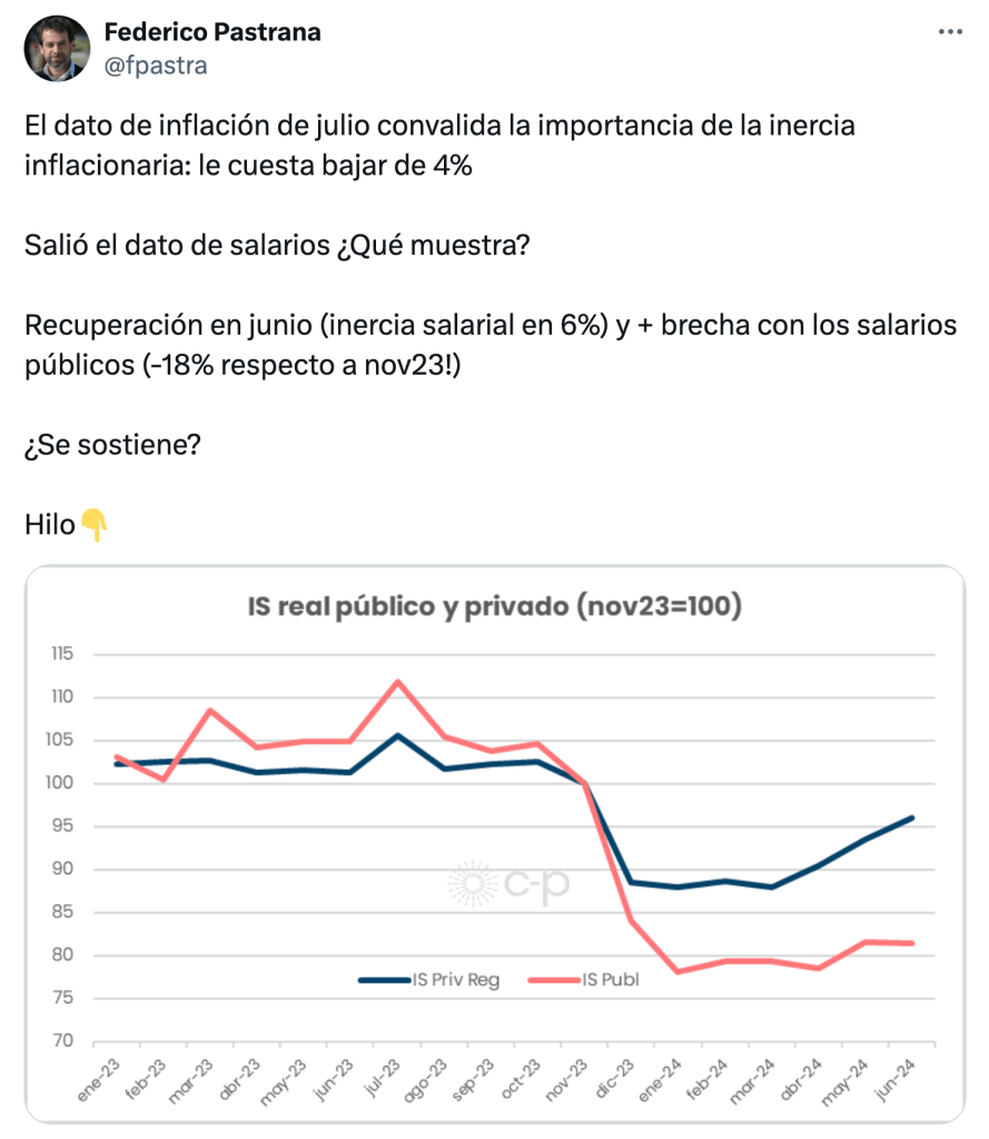 «¿Los salarios puedan seguir negociándose en torno al 6% (como en junio), ese proceso se sostiene? Varias paritarias grandes muestran aumentos entre 4 y 2% mensual para los próximos meses. Esto siembra grandes dudas para lo que viene. Las dificultades para seguir desinflacionando, también», cierra.