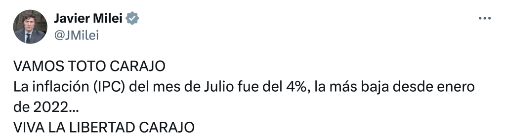 En medio de esas insólitas ensaladas de números que lo llevan a afirmar que la inflación no es el 263% de los últimos 12 meses ni el 87% acumulado hasta julio, sino de… «ocho por ciento anual», se quejó –una vez más en penumbras y denunciando ruidos inaudibles– de que «todo el mundo ve el milagro, menos los argentinos». Toda una confesión.