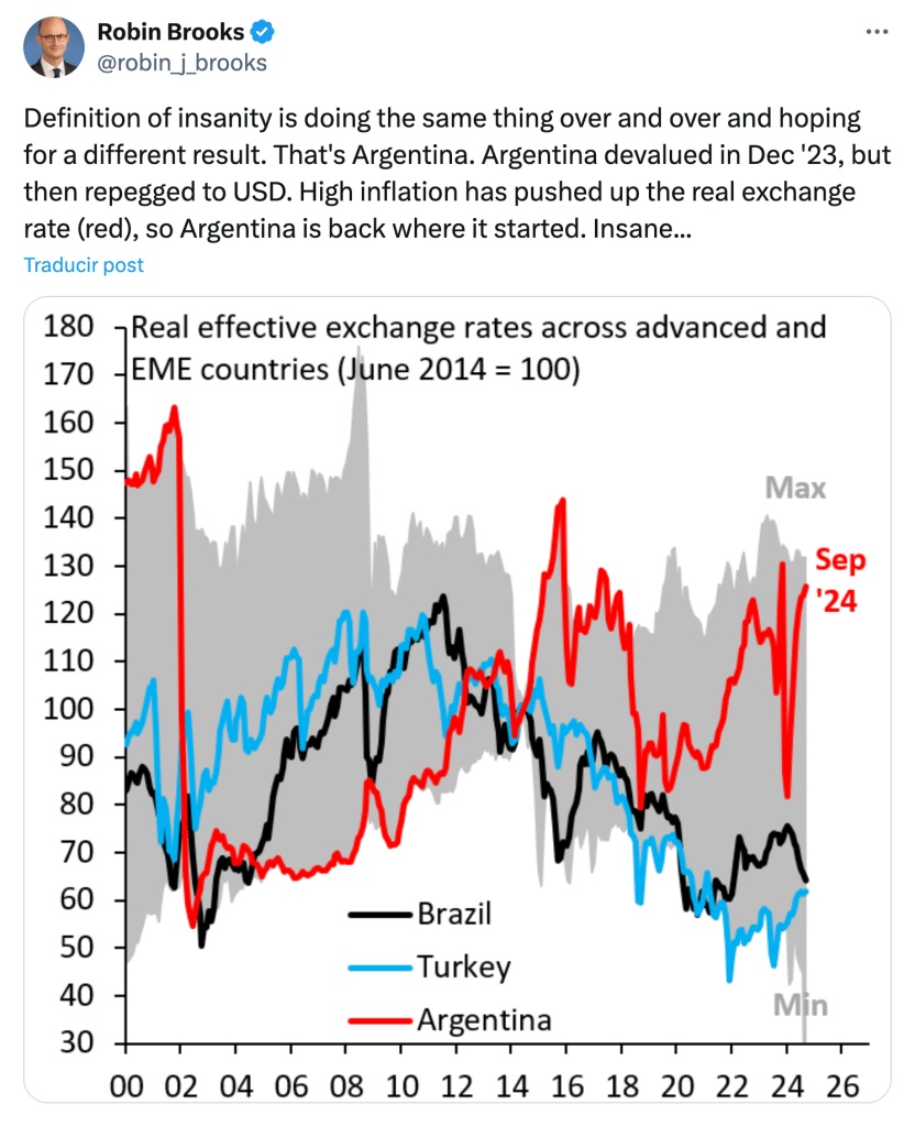 Robin Brooks es economista senior de la influyente Brookings Institution. Anteriormente había sido economista jefe del Instituto de Finanzas Internacionales (IIF, la entidad que reúne a los principales bancos del mundo) y hombre de Goldman Sachs. Según señaló este jueves, «la definición de locura es hacer lo mismo una y otra vez, y esperar un resultado diferente. Eso es Argentina. Argentina devaluó su moneda en diciembre de 2023, pero luego volvió a atarla al dólar. La alta inflación ha hecho subir el tipo de cambio real (curva roja), así que Argentina está de nuevo donde empezó. Loco…».