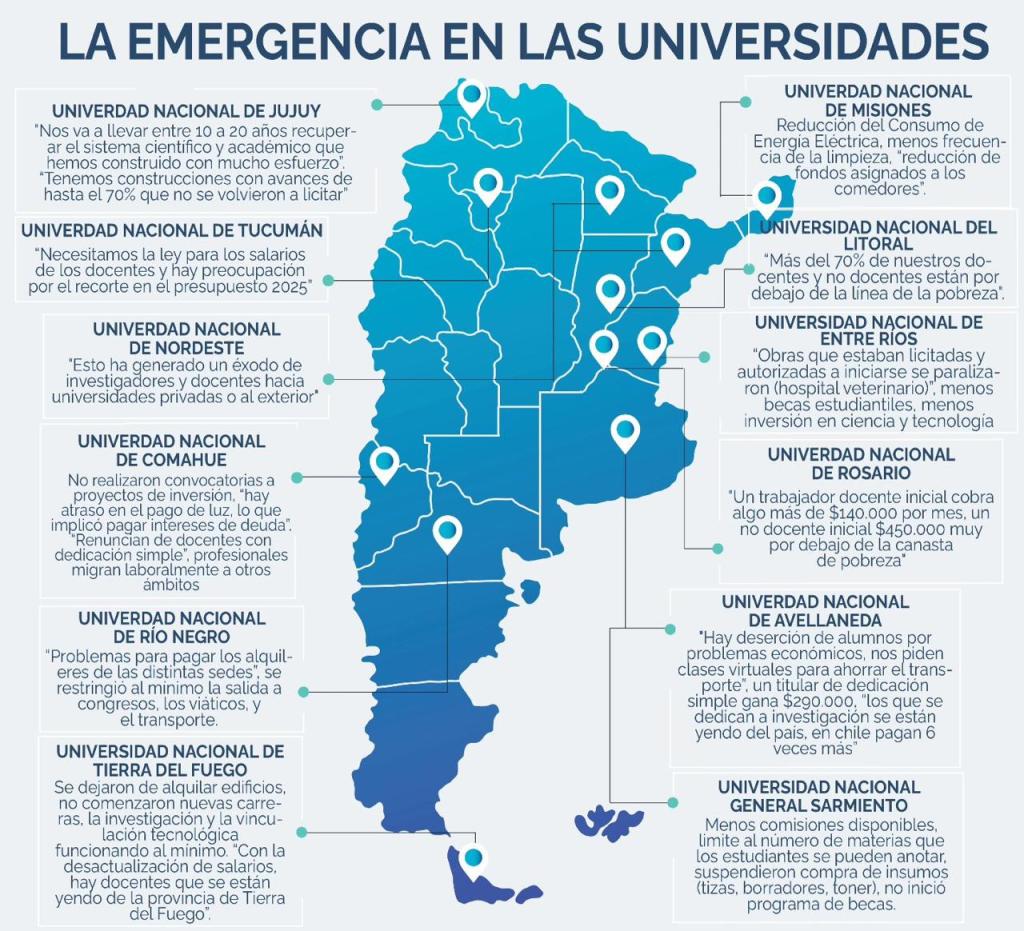 La gravedad de la situación quedó plasmada en el comunicado presentado en la marcha por la Federación Universitaria Argentina (FUA). Desfinanciamiento generalizado, severo atraso salarial, éxodo de profesores e investigadores… La situación es preocupante.