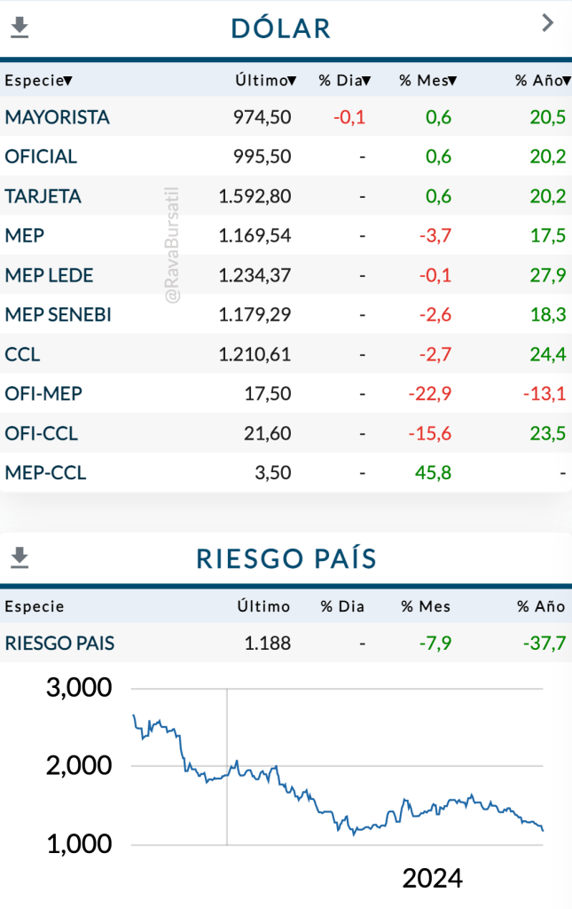 Los tipos de cambio paralelos siguen en caída libre y el riesgo país perforó a la baja los 1.200 puntos básicos, novedades celebradas en el Palacio de Hacienda.