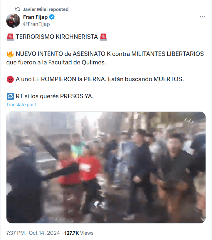 Fran Fijap mintió y Milei reposteó que lo ocurrido en la UNQ fue «un intento de asesinato K» y que «están buscando muertos». Algún medio importante rebuznó algo similar.
