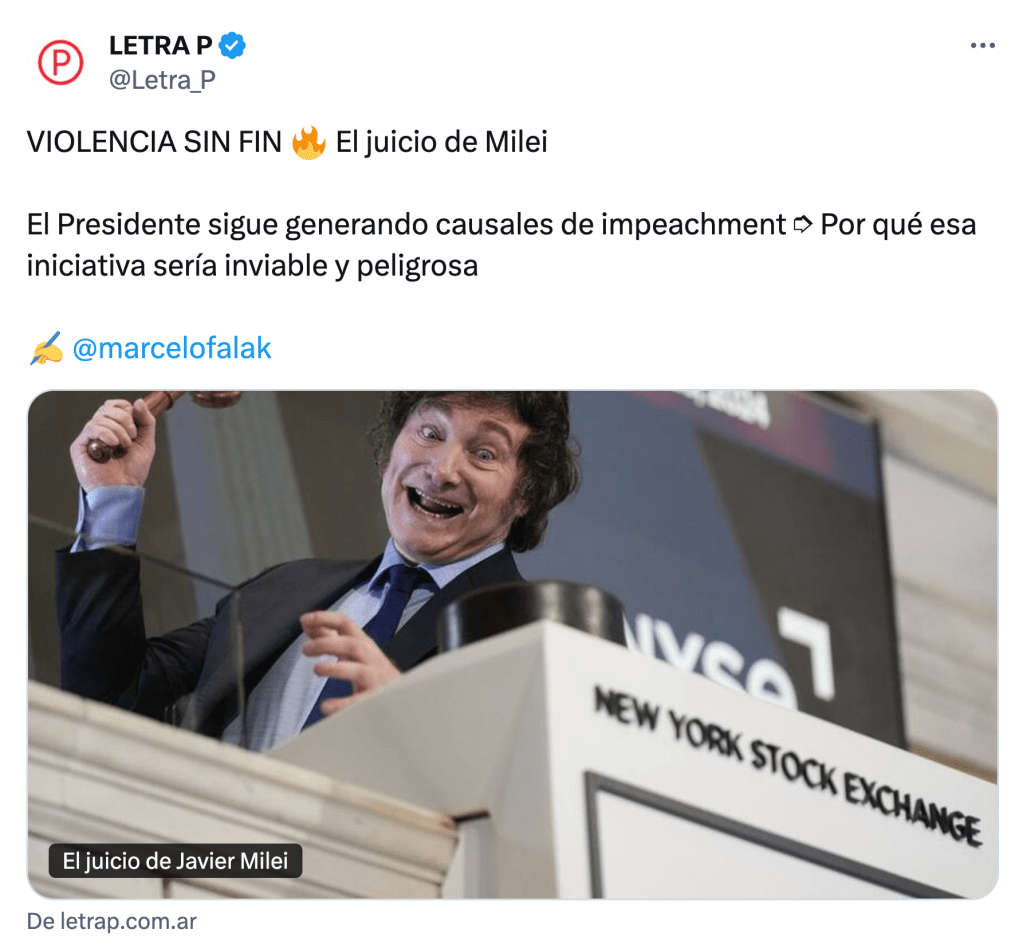 Fuera de eso, es pesado lo que los separa, por caso la pretensión del anarcocapitalista de confrontar fuerte con el Grupo Clarín y con el diario y la web de La Nación, además del periodismo en general, al que imagina arrodillado o hundido.