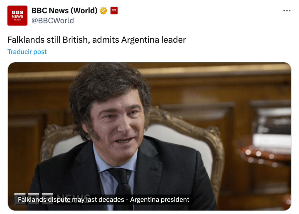 Volvamos atrás. También en mayo, el Presidente le concedió una entrevista a la BBC en la que no sólo reiteró su admiración por la «brillante» Margaret Thatcher sino que también admitió que las islas ocupadas «todavía son británicas». La lectura de ese y otros medios del Reino Unido fue unívoca: «Las Malvinas siguen siendo británicas, admite el líder argentino».