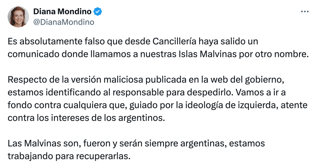 Intervienen en ella demasiadas manos. Por lo pronto, la publicación mencionada era totalmente innecesaria dado que refería a una reunión que Diana Mondino había mantenido con el vicepresidente del Comité Internacional de la CICR Gilles Carbonier el 16 de octubre, esto es una semana antes… La misma había sido oportunamente consignada por el portal de la Cancillería del modo correcto, esto es llamando a las Malvinas por su nombre.