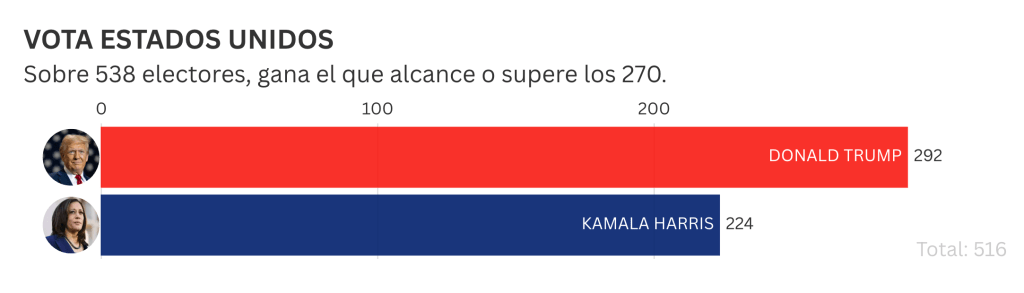 Las proyecciones le daban al republicano 267 votos, al filo del número mágico de 270 en el Colegio Electoral, lo que, con varios estados todavía por contar, parecía sellar la suerte de Kamala Harris.