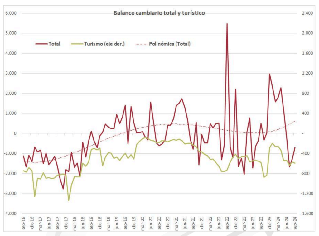 «Es seguro que habrá durante el verano de 2025 un incremento del turismo argentino al exterior, el cual aumentará el déficit cambiario del sector. Proyectamos una pérdida neta de 3.000 millones de dólares por esta vía, muy por encima del saldo comercial de septiembre, que fue de 981 millones. De esta manera, el balance cambiario total será muy afectado por la sangría de divisas que se generará por turismo», completó.