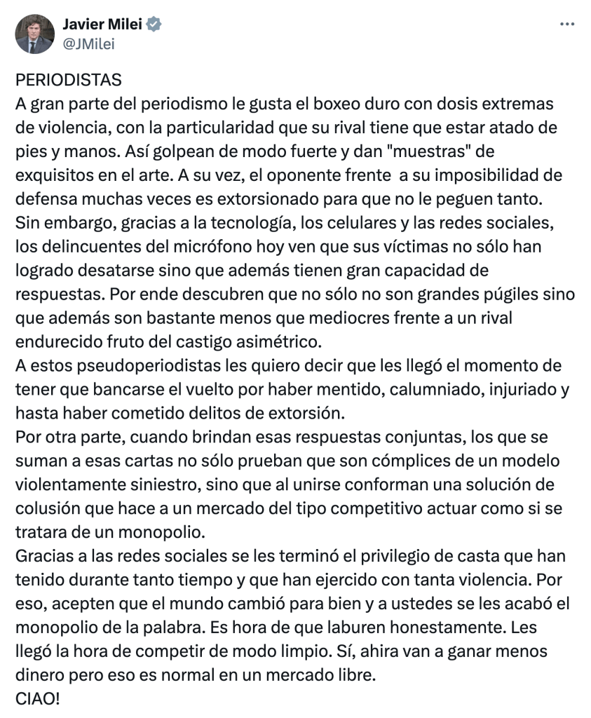 Sin mencionar a Longobardi, pero aludiendo claramente a él, señaló, en un largo posteo, que «a gran parte del periodismo le gusta el boxeo duro con dosis extremas de violencia, con la particularidad que su rival tiene que estar atado de pies y manos». Al menos esta vez no dijo también «envaselinados»…