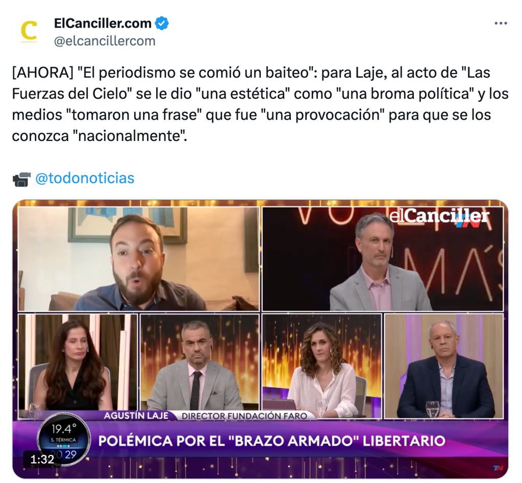 La idea de «la prensa» como enemiga –en un 85%, dice el Presidente; el resto sería todo suyo– se instaló con especial fuerza desde el lanzamiento de la agrupación el lanzamiento de la agrupación Las Fuerzas del Cielo, en el que Daniel Parisini –alias Gordo Dan– habló de «brazos armados» y «guardias pretorianas» de «nuestro líder» en medio de una iconografía asumida como nazi-fascista –se supone que sólo para generar visibilidad– incluso por el ideólogo oficial Agustín Laje, jefe asimismo de la nueva Fundación Faro para la batalla cultural.