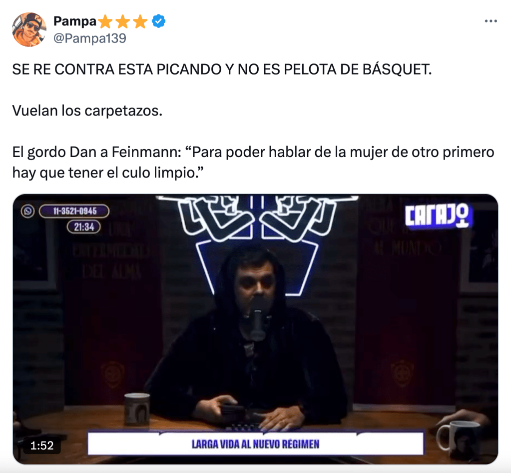 El agitador replicó desde su streaming en el canal Carajo que «para poder hablar de la mujer de otro» –la esposa de Gordo Dan, Belén Casas, es jefa de Gabinete en la Subsecretaría de Política Universitaria– «primero hay que tener el culo limpio». O sea, no explicó nada sobre el estado de su trasero, sino que le exigió al oponente certificado de limpieza propia para poder hablar.