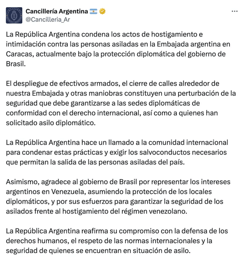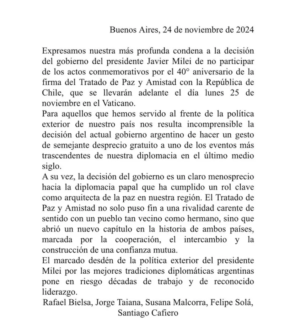Un grupo de excancilleres había expresado este domingo en un comunicado su «profunda condena» a la decisión de Milei de no mandar al canciller, a la cual calificó de «incomprensible» y de «desprecio gratuito». El texto fue firmado por una mayoría de peronistas –Santiago Cafiero, Felipe Solá, Jorge Taiana y Rafael Bielsa–, pero también por quien fue la primera jefa de la diplomacia de Mauricio Macri: Susana Malcorra.