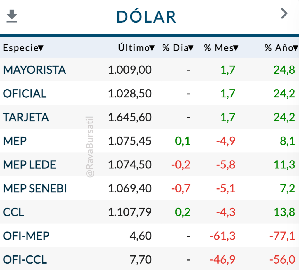 Como contrapartida, el peso no deja de apreciarse. Mientras la inflación acumulada desde enero ronda el 110%, la evolución del tipo de cambio oficial fue del 24% y la del paralelo «contado con liquidación», de apenas 14%… Eso supone una revaluación de la moneda nacional del 85 al 95%, aproximadamente y según el caso, en términos reales.