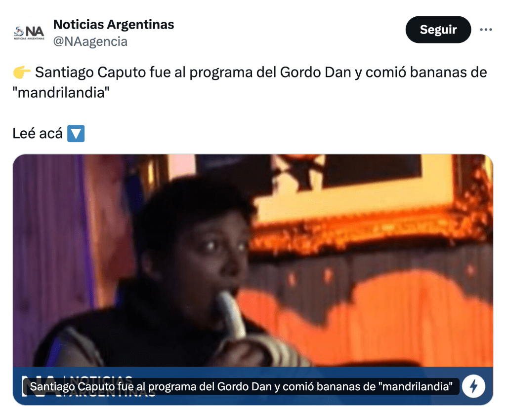 No fue menor que Caputo haya aparecido en Carajo, el canal de streaming del mencionado Dan, para simplemente comerse una «banana de Mandrilandia». Con ese gesto –verdaderamente inusual en un hombre casi sin rostro ni voz ante la sociedad, y que se desarrolló en penumbras–, Caputo no sólo bendijo a Parisini y su retórica homofóbica, que también cautiva al Presidente, sino que tendió su manto protector sobre una forma de comunicación de violencias, fake news y amedrentamientos que, con asombroso paralelo, funcionó en el Brasil de Jair Bolsonaro bajo el nombre de Oficina del Odio.