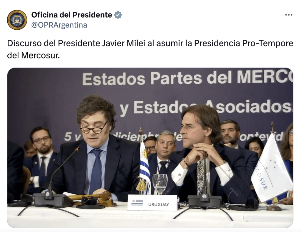 La intervención del mandatario en la cumbre de presidentes del Mercosur del último viernes resultó ilustrativa del desacople entre sus deseos y la realidad. Al asumir la presidencia pro tempore del bloque, lo definió como «un escollo» y «una prisión» para el desarrollo comercial y productivo. Prometió trabajar para reducir drásticamente el arancel externo común y liberar a los países de la obligación de negociar acuerdos de libre comercio en conjunto, y hasta presentó la modernización del club y su abandono como alternativas igualmente viables.