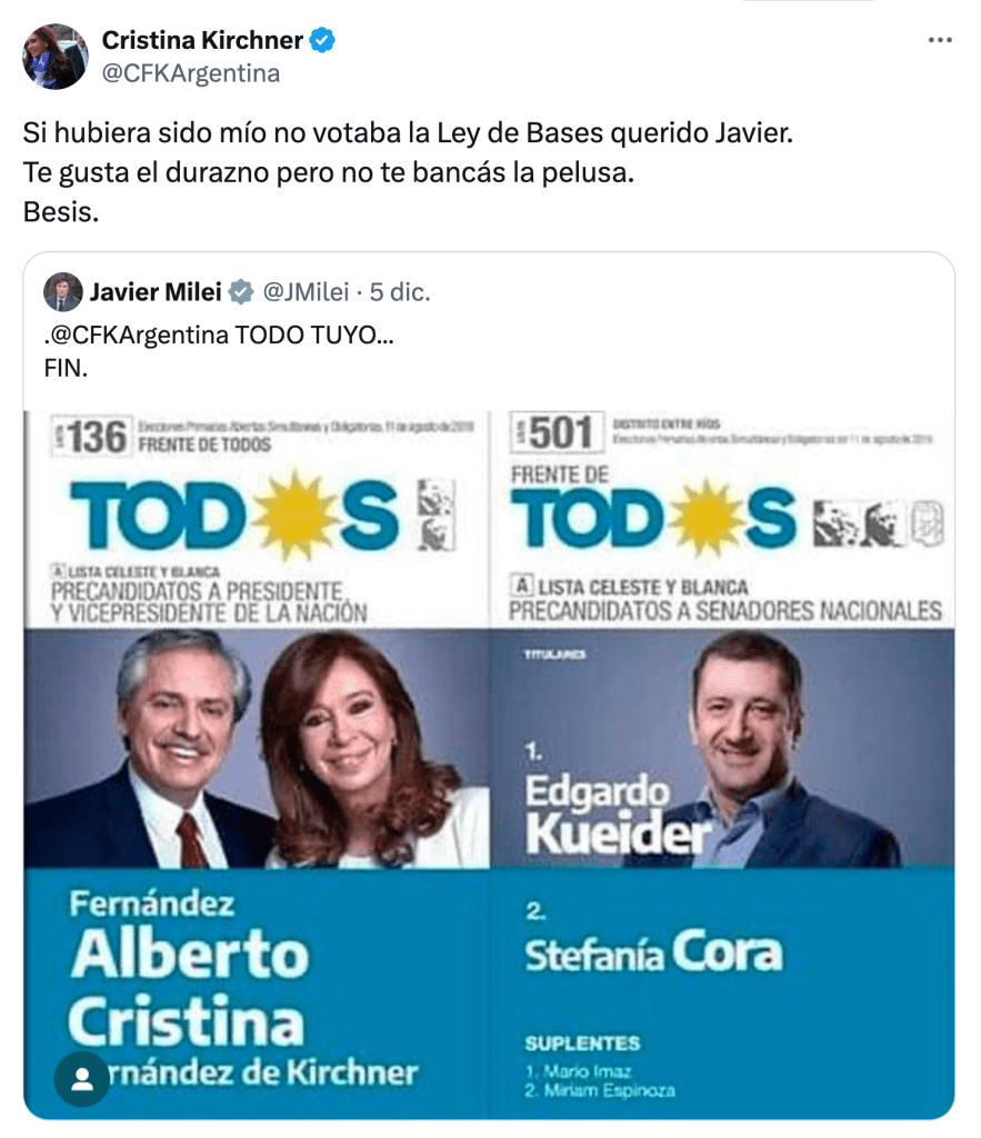 Esa incomodidad se hizo extrema cuando el peronismo pidió para el jueves una sesión destinada a fin de tratar la expulsión de Kueider. Las actitudes en torno a ese reclamo podrían dirimir quién pierde en el nuevo deporte nacional llamado «lanzamiento de kuéiders» estrenado en Twitter por Milei y Cristina Fernández de Kirchner.