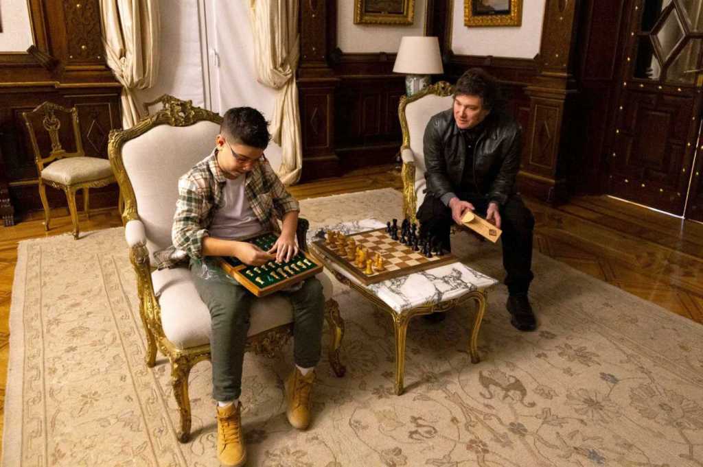 El futuro ya llegó: Javier Milei y Faustino Oro, el niño de diez años que se convirtió en el maestro internacional de ajedrez más joven de la historia.
