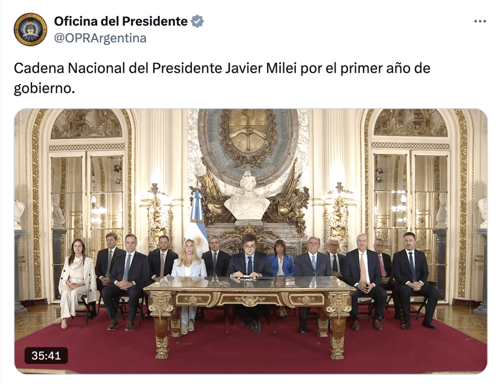 Javier Milei se esforzó en la cadena nacional con la que hizo el balance de su primer año en insuflar esperanza, el amortiguador que explica su nivel de imagen e impide que el auto del gobierno ultraderecha se clave en los baches que cavan la bicicleta financiera de Toto Caputo, el marasmo del consumo y el empobrecimiento de la clase media.