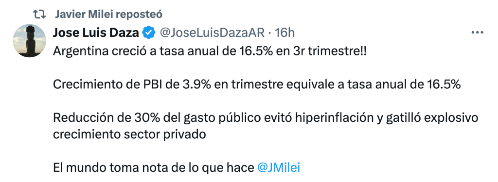El Presidente volvió a practicar su conocido chamanismo matemático, que consiste en extrapolar lo que pasa en un día o en un período al infinito. Así, elucubró que el 3,9% de rebote frente al abismo del período abril-junio, que probablemente haya sido el principio del fin de la recesión porque todo indica que la recuperación continúa en el tramo final del año, aunque esta sea desigual y carezca de los motores de la industria, la construcción y el consumo masivo, significa algo así como un crecimiento anualizado del 16,5%. Risible.