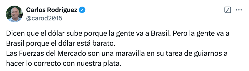 «Hay que tener en cuenta que el dólar se está fortaleciendo contra el real, el yuan, la rupia, el euro… Nosotros veníamos al margen de esa tendencia, ¿pero hasta cuando puede durar eso?», continuó.