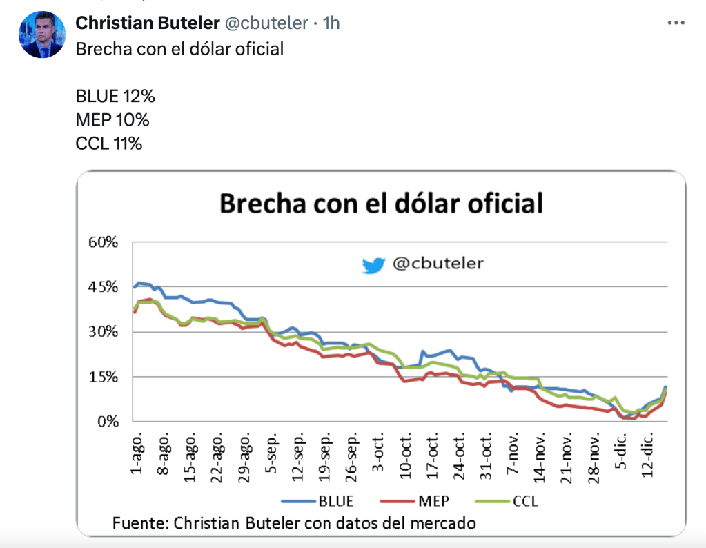 «Aun con este rebote, recién se vuelve a una brecha del 10 al 12%, que sigue siendo baja», matizó Buteler. «Es lógico que cuando los tipos de cambio se mueven en estos porcentajes, todo el mundo prenda las alarmas, pero cuando se pone la tendencia en contexto se observa que no es tan grave«, añadió.
