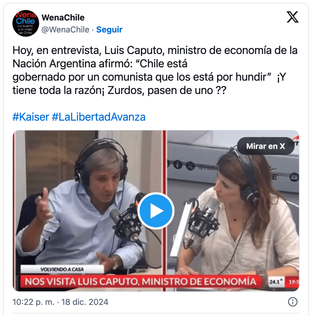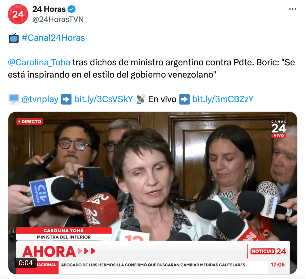La ministra chilena de Interior, Carolina Tohá, respondió a un exabrupto de Toto Caputo contra Boric señalando que el ministro de Economía «se está inspirando en el estilo del gobierno venezolano» de Nicolás Maduro. ¿Milei y el venezolano se espejan?