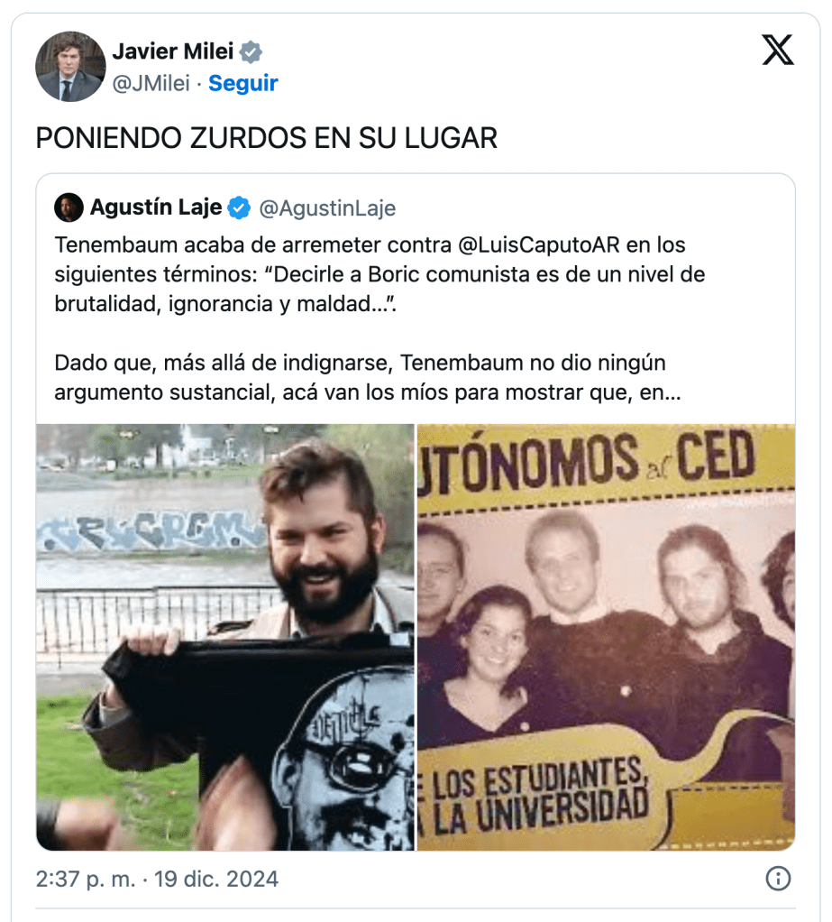 Comandante de la guerra santa cultural, el Presidente no llamó al orden a un ministro que se metió en el área de otro, Gerardo Werthein, sólo para complicarle la vida. Al revés, hizo suya la justificación que intentó el planfletista Agustín Laje sobre la concentración de comunismo en sangre de Gabriel Boric al repostearlo y cantar retruco: «Poniendo (a) zurdos en su lugar».