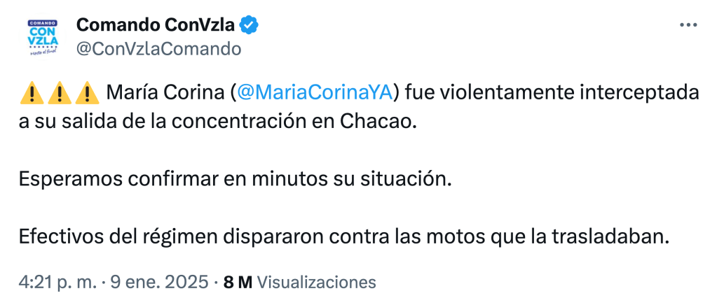 Poco después se divulgó un video en la que la propia líder antichavista afirmaba estar a salvo, pero la confusión reinaba. La misma fuente que dio cuenta del arresto aclaró que este fue breve y que ya había recuperado la libertad.