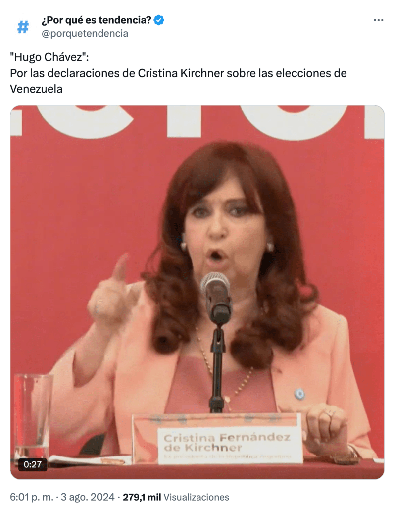 La expresidenta se refirió a la cuestión seis días después de aquellos comicios, cuando, en tono alto, dijo: «Pido, pero no solamente por el pueblo venezolano, por la oposición, por la democracia, por el propio legado de Hugo Chávez, que se publiquen las actas». Sin embargo, de inmediato postuló que no hay en ese país «ni diablos ni ángeles» e ironizó sobre la presencia de la líder opositora, María Corina Machado, en una manifestación –»afortunadamente ha tenido poco tiempo de clandestinidad», dijo, como si no sobraran en Venezuela dirigentes presos, proscriptos por el poder judicial y exiliados–. Desde entonces ha guardado absoluto silencio.